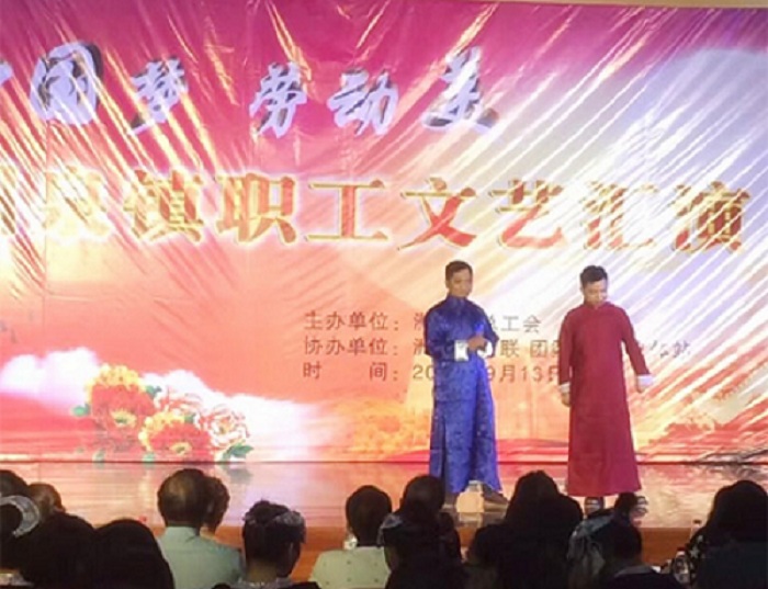 913日晚上 ,,,,,, ,,迎国庆暨“中国梦·劳动美”洲泉镇职工文艺演出总决赛在京马电机厂举行 。。 。。。 。由各个单位带来的音乐情景剧、舞蹈、相声、小品等多种形式的节目轮替上阵 ,,,,,, ,,为在场观众贡献了一道视听盛宴 。。 。。。 。由我公司项目装备部俞学飞和手艺中心吴徐冯演出的相声《杂学唱》获得了此次晚会的三等奖 。。 。。。 。