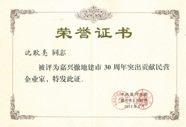 市委副书记高玲慧首先宣读了市委、市政府《关于表扬嘉兴撤地建市30周年民营企业生长先进集团和先进小我私家的决议》,,,,,,市四套班子向导为获奖企业和小我私家颁奖。。。。。。。。公司董事长沈耿亮被授予“突出孝顺民营企业家”。。。。。。。。